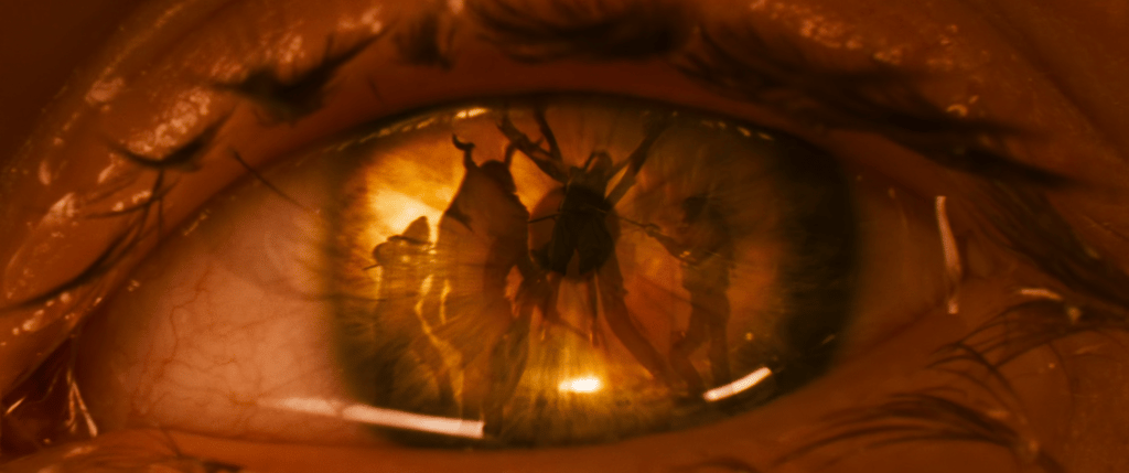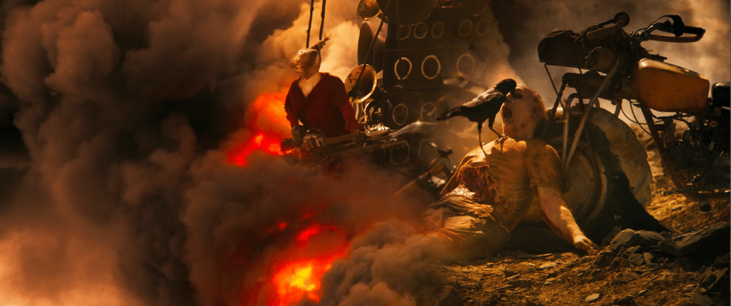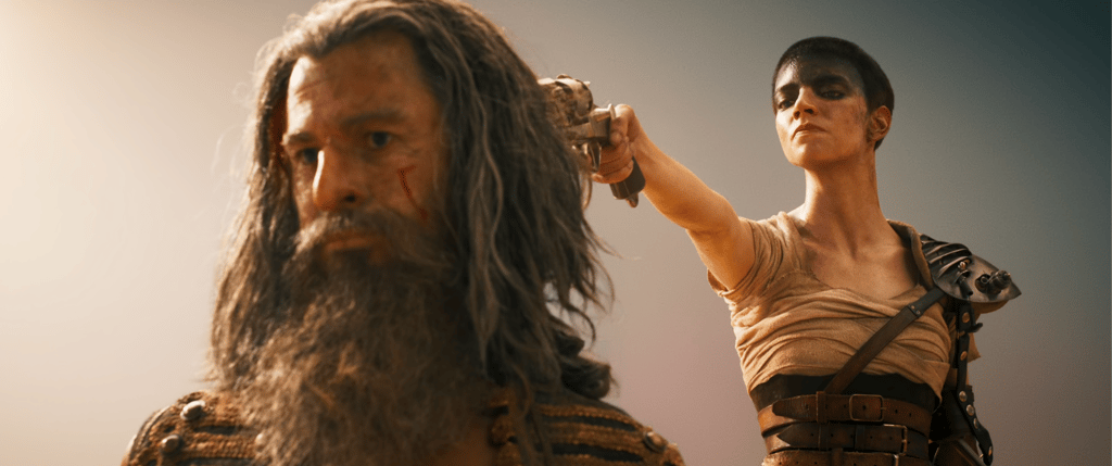 Une volonté de prolonger auditivement l’impact du récit qui se retrouve dans le rapport au dialogue. La tyrannie de l’image de Fury Road, ses cris et grognements laissent place à un récit qui compose bien plus avec des mots. Il est en effet conté par un narrateur, l’Homme-Histoire, dont on suppose que Miller se fait l’intermédiaire en illustrant les propos. Les personnages de cette épopée sont de même bien plus bavards, Dementus en tête dont la menace semble bien plus verbale que physique : c’est lorsque Furiosa lui ôte la voix qu’il est définitivement vaincu. Le film se clôture même par un ultime échange entre les deux ennemis, Dementus et Furiosa, là où le rideau de fer de Fury Road se refermait sur un dernier regard. Miller ne délaisse néanmoins pas la maestria filmique qu’on lui connaît et demeure pleinement un cinéaste de l’iris. C’est sur la rétine de Furiosa, dont le traumatique reflet de la mort d’une mère martyr s’imprime, que s’attarde sa caméra. Le casting d’Anya Taylor-Joy est, dans ce sens, excellent : ses échanges de regard avec Pretorian Jack sont à couper le souffle d’émotion.