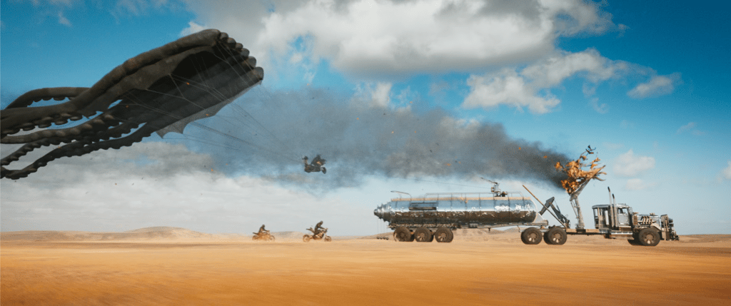 Même constat quant aux schémas des scènes d’action. L’attaque du Porte-Guerre évoquée plutôt se distingue en intégrant une dimension aérienne à la poursuite : les motos ennemies se transforment en paramoteurs afin d’approcher le convoi au plus près. Si Mad Max 2 ajoutait déjà cette dimension verticale à sa séquence finale, à travers l’autogire piloté par le Gyro Captain, Furiosa en fait une composante à part entière de sa séquence d’action centrale.