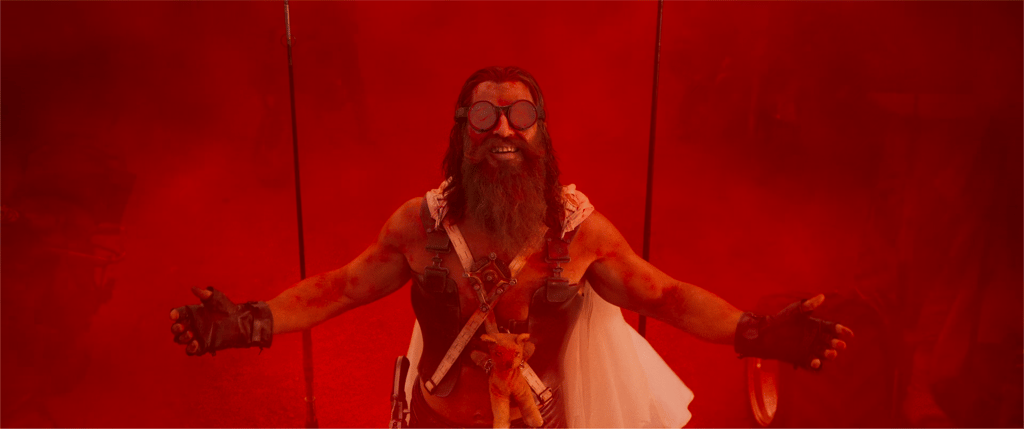 Quant au costume évolutif, c’est l’exemple de l’antagoniste Dementus qui vient d’abord à l’esprit. S’il débute le long-métrage maculé d’une toile de parachute devenue coule blanche (l’artistique à partir du technique, encore) et de cheveux blonds, cette apparence messianique mutera au fil du récit. La pâleur de son habit est en effet rapidement entachée lorsqu’il découvre le « sang du ciel », un fumigène rouge projeté sur lui, qu’il en prend la couleur et devient Red Dementus. Les années passent et la couleur s’estompe, ne demeure que la noirceur d’un homme qui ne se distingue que par son vice : Dark Dementus. Au-delà d’une esthétique, l’habit se fait témoin des nuances de celui qui le porte. C’est ainsi que Furiosa, quand vient l’affrontement final, s’en empare et s’en pare. Une façon pour elle de se réapproprier les actes cruels d’un homme qui ont malgré tout façonné la femme qu’elle est devenue.