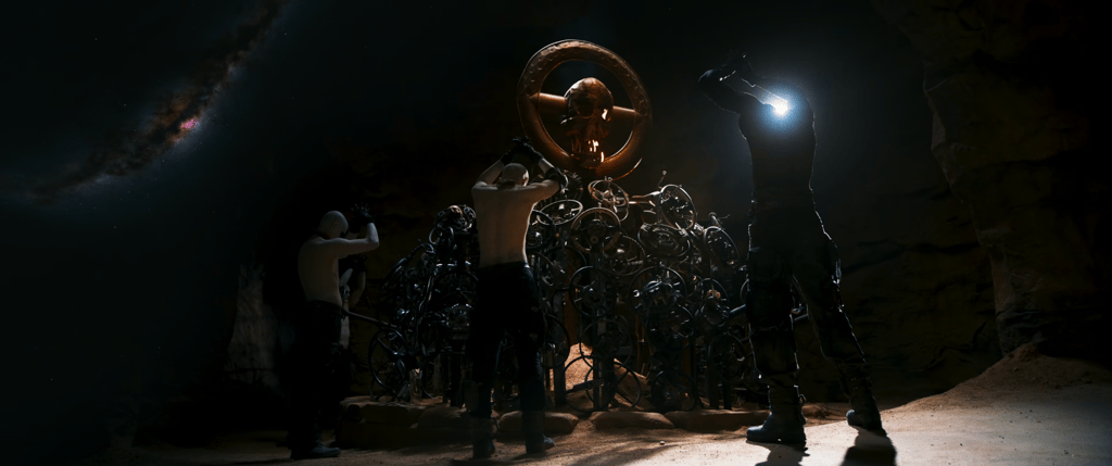Un conflit dichotomique qui se traduit en pratique, à l’instar de tous les antagonistes de la franchise, par le rapport au mot. Par son omniprésence verbale, Dementus s’inscrit dans cette tradition orale redevenue norme vis-à-vis de la transmission du mythe. La rhétorique est pour lui sine qua none à l’élévation mythologique, afin de draper ses faits d’arme d’une dimension épique : « Do you have it in you to make it epic? (as-tu le pouvoir de devenir un mythe ?) ». Le mythe qu’il poursuit par la parole, Furiosa le forge par le geste, en silence. Inconsciemment, il mythifie oralement celle qu’il a toujours méprisée, et ne sera souvenu qu’en agent de sa théogonie.
