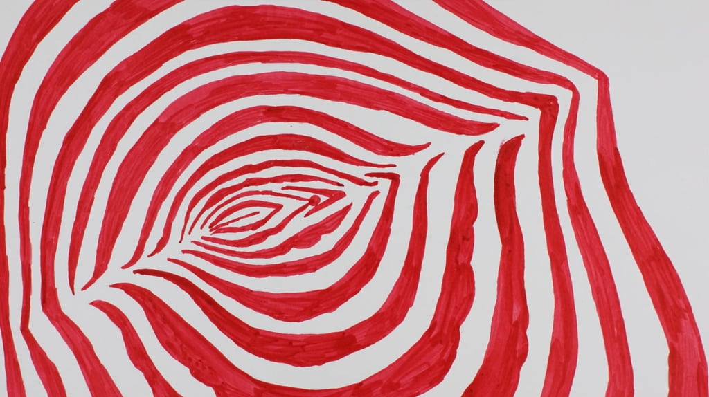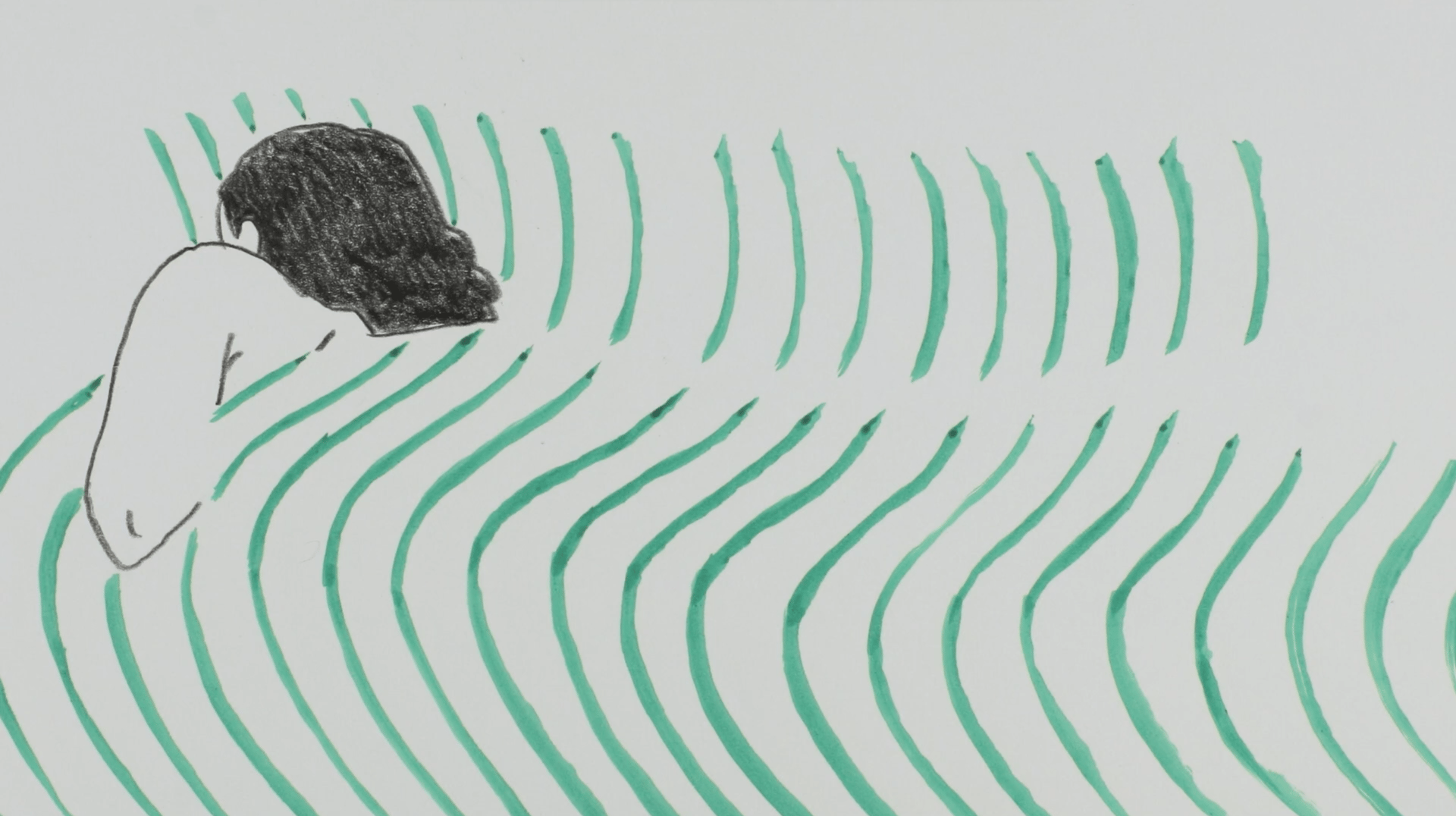 La bande sonore laisse entendre des ébats sexuels, le film inclut certaines images pornographiques, tout en les confrontant à une figuration plus suggestive. On retrouve diverses manières de représenter l’acte sexuel, par exemple. Deux silhouettes entremêlées derrière un paravent ; des bras et des jambes chaotiquement échappés de sous la couette ; des portions de corps, des caresses. Il y a ce moment où un corps masculin nu se promène nonchalamment, cigarette à la bouche, dans une cavité obscure organique. Une scène qui évoque sans aucun doute le manque de respect des hommes envers leurs partenaires, la vision du corps féminin comme un espace à occuper pour la figure masculine invasive et indifférente. A l’opposé, l’orgasme féminin est mis en scène comme une explosion sensorielle totalement figurative, la vulve n’est plus réduite à un schéma anatomique mais démultiplié en un ensemble de traits clignotants qu’accompagne une envolée musicale.