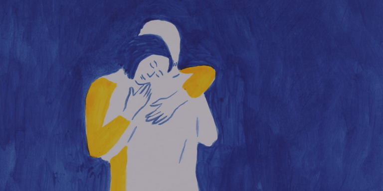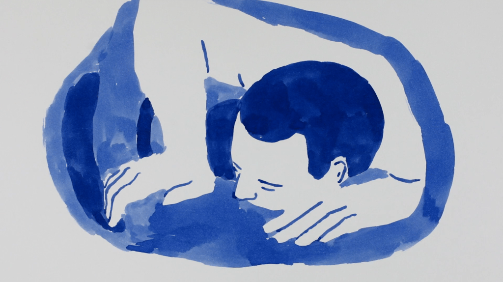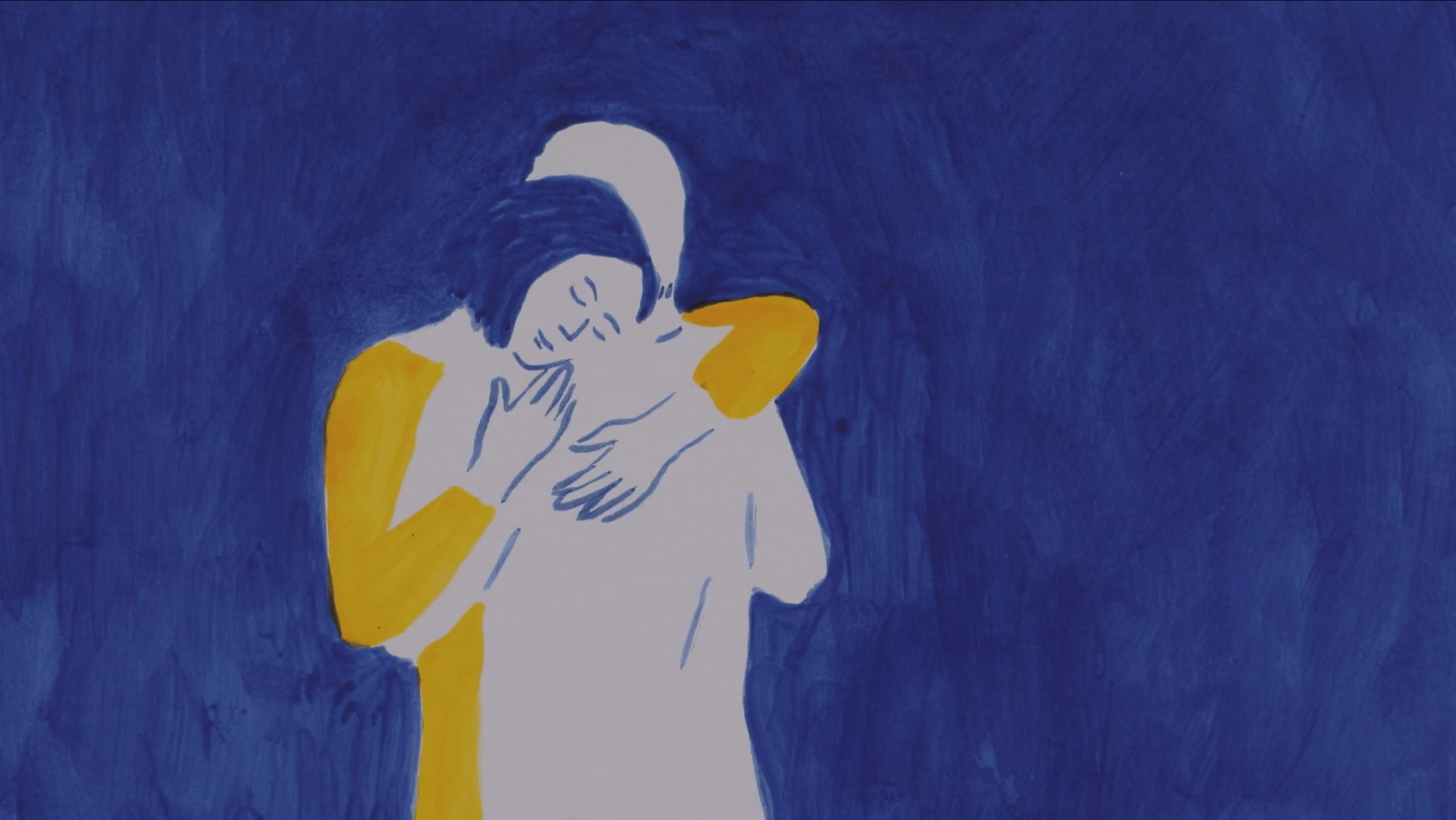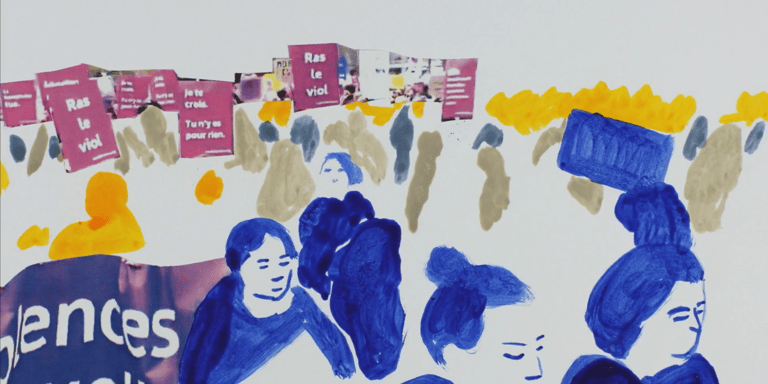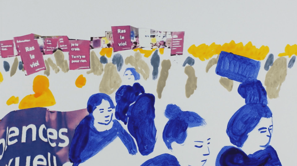 Le film ne garde en effet des entretiens issus de l’enquête que les bandes sonores, qui en constituent la trame, ce qui fait que Jeanne Paturle et Cécile Rousset n’ont jamais vu les visages des femmes qu’elles ont dessinées. Chacune des voix est ainsi incarnée par des visages imaginaires, imaginés, chaque femme interrogée se distingue par une palette définie : le rouge, le vert, le jaune, et tout autour d’elles, un bleu environnant, un bleu plus ou moins sombre, un bleu immanquablement masculin.