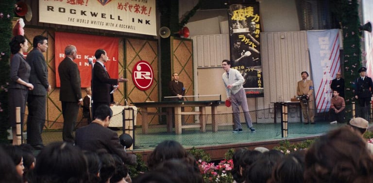 Les années 50 sont omniprésentes à l’écran, des costumes d’époque en passant par les rues de New York qui deviennent un véritable terrain de jeux pour Josh Safdie. Cette ville est représentée comme foisonnante, pleine de rebondissements mais aussi d’obstacles venant faire barrage à l’ambition de Marty. La temporalité post seconde guerre mondiale est aussi matérialisée par le traumatisme encore bien présent qu’a représenté la déportation des juifs à cette époque, même si le film choisit de l’évoquer à travers un ton plus « léger » et en arrière plan, refusant de faire de Marty Supreme un drame historique. Parce que ce n’est pas ce qui intéresse ici Josh Safdie, qui mélange audacieusement les genres, du thriller à suspens au faux biopic en passant par la comédie burlesque. Le film change régulièrement de ton au moyen de séquences particulièrement drôles et grotesques qui viennent dompter l’urgence constante qui ponctue le récit. Cette période est aussi fortement marquée par la rivalité entre les États-Unis et le Japon, représentée par le duel entre le champion Japonais Endo et la star montante Marty.