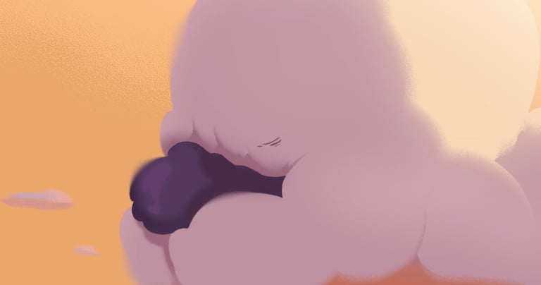 Nube est à la première lecture une métaphore de la maternité représentée par ce duo mère et fille de nuages. Noma, la mère, est blanche comme la neige, imposante et protectrice, tandis que Mixtli, petit nuage sombre et gris, découvre naïvement et joyeusement la vie, le ciel et de ses habitants ; son cœur bat d’une couleur pourpre, comme s’il voulait sortir de son enveloppe corporelle, tout à l’euphorie de ces petits moments vécus intensément. Cela nous dit que la vie est faite de cycles, de hauts et de bas, qu’elle n’est tout simplement pas linéaire.